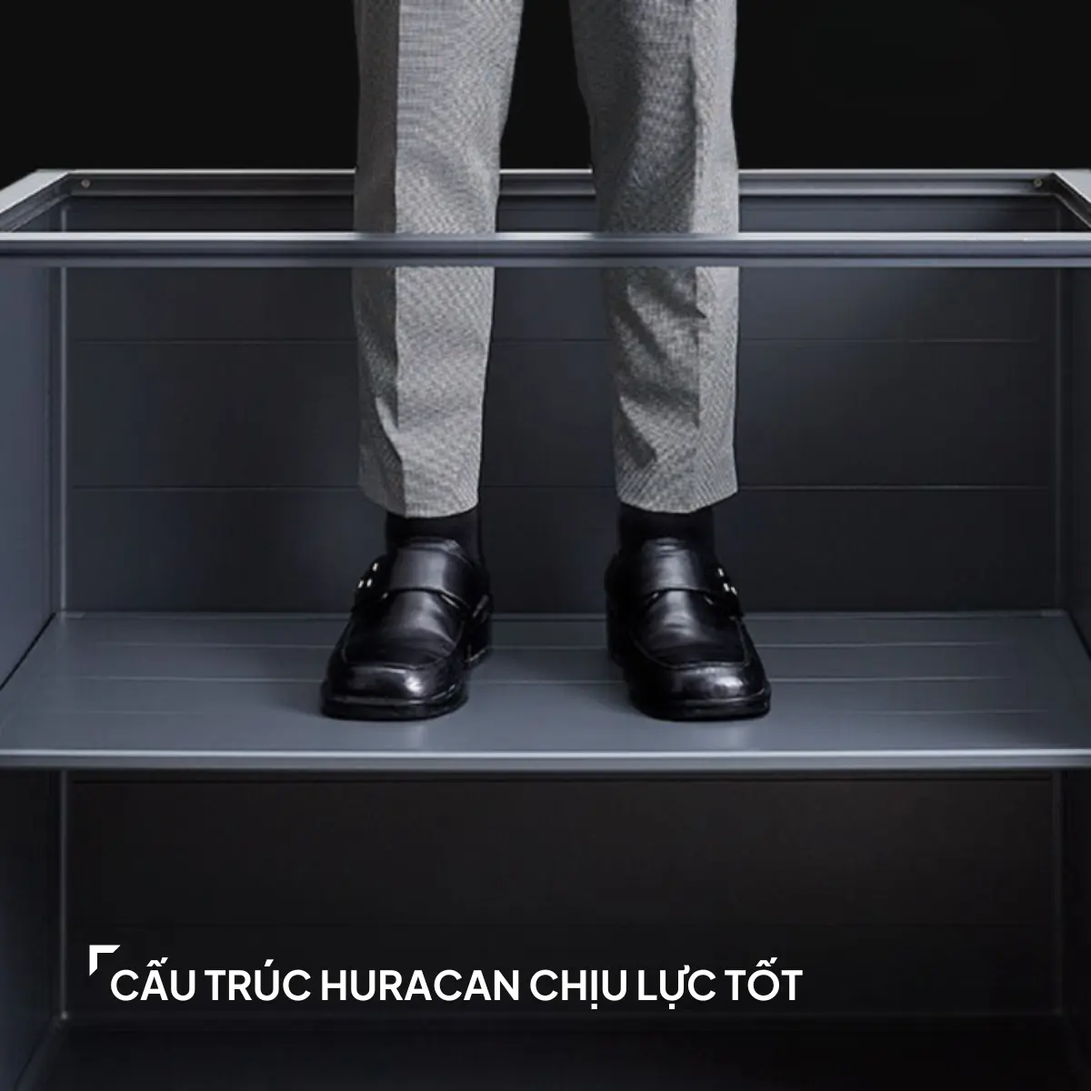 Cấu trúc Huracan – hệ khung vách nhôm định hình đặc biệt – giúp tủ bếp giữ được form dáng vững chắc, không bị xệ cánh hay cong vênh khi chịu tải trọng lớn.