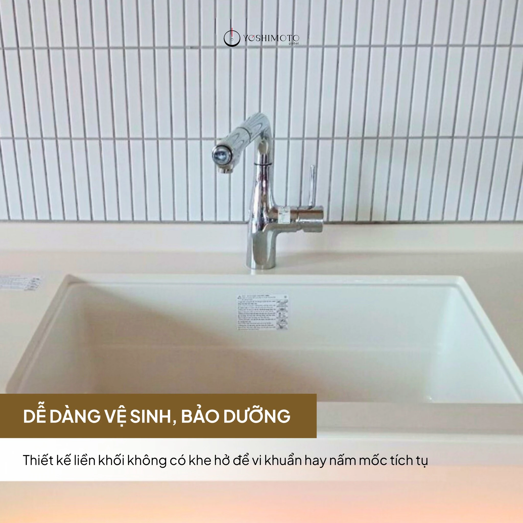 Khác với những mẫu mặt đá cần trám keo giữa mặt và lưng bếp, gờ chắn nước Yoshimoto được ép đúc liền khối, hoàn toàn không có mối nối.