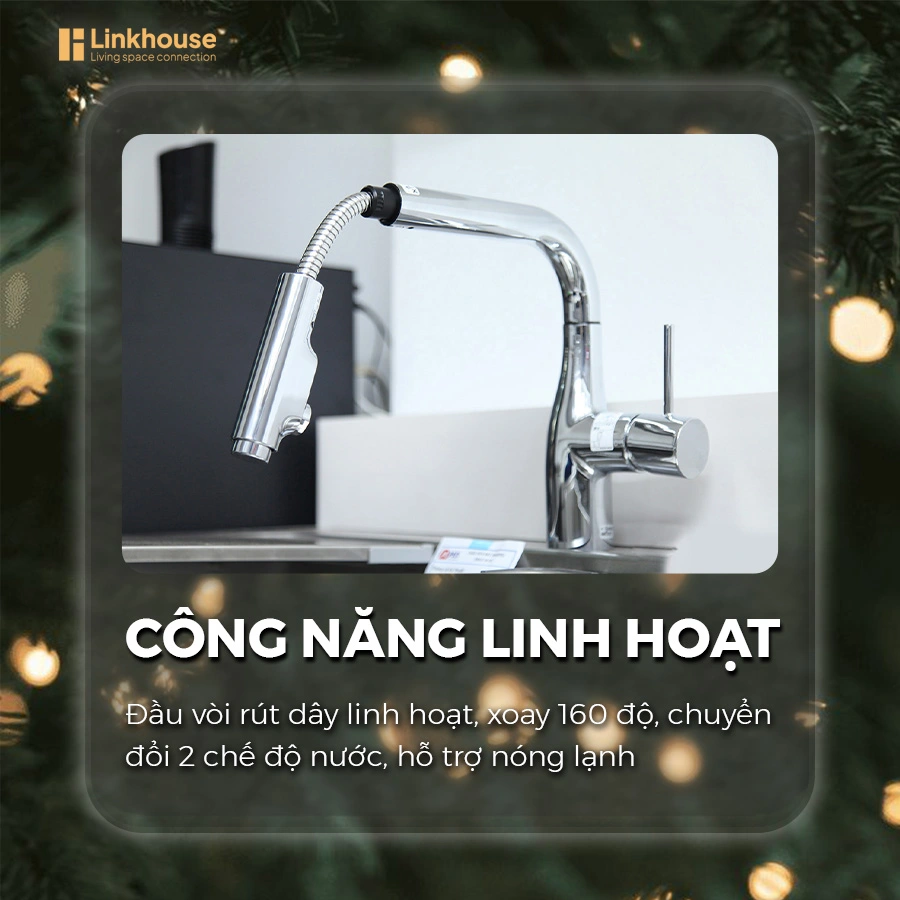 Sản phẩm được trang bị đầu vòi rút dây linh hoạt, giúp người dùng dễ dàng xoay chuyển để rửa rau củ, vệ sinh bát đĩa hoặc làm sạch góc chậu.