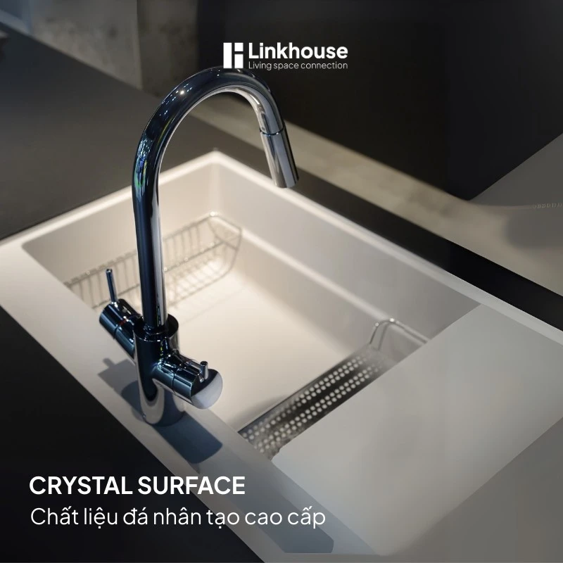 Điểm nổi bật đầu tiên của chậu rửa HS950 chính là chất liệu đá nhân tạo cao cấp Crystal Surface – loại đá được phát triển riêng cho nhu cầu sử dụng tại khu vực bếp, nơi thường xuyên tiếp xúc với nước nóng, chất tẩy rửa và áp lực từ vật dụng nặng.